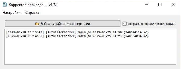 После этого окно выбора файла закрывается, происходит получение данных СКУД, и готовый файл отправляется на почту (Если установлена галка "Отправить после конвертации").