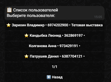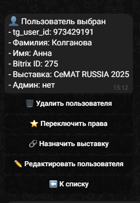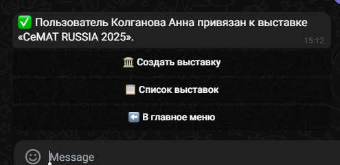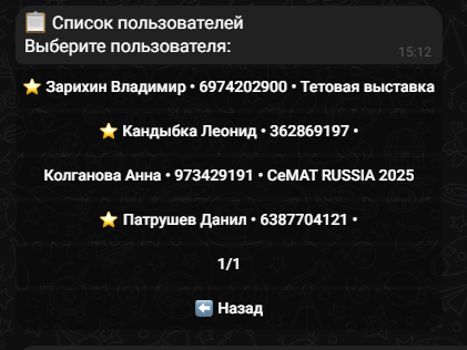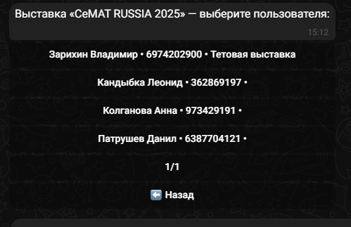 Для этого заходим "Выставки" -> "Список выставок" -> выбираем нужную выставку -> "Назначить выставку" -> выбираем нужного пользователя